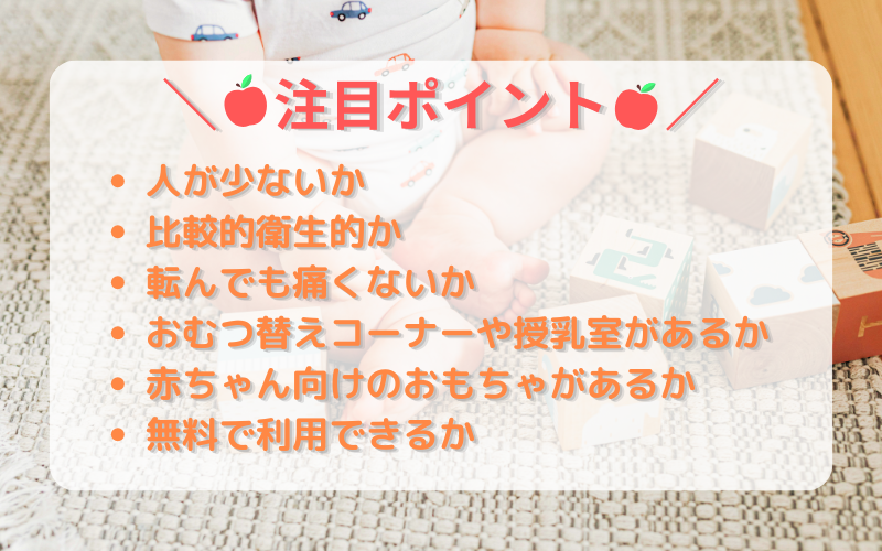 0歳・1歳の赤ちゃんとのお出かけは、「安心して過ごせるかどうか」が何より大切です。そこで、遊び場を選ぶ際に注目したいのが以下のポイント。