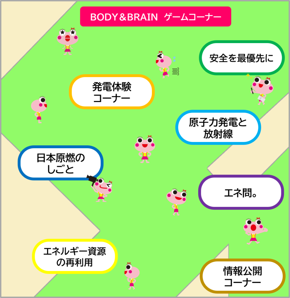 エネルギーや自然をテーマにした個性豊かなキャラクターたちで、館内の展示やゲームをより楽しくしてくれる存在です。子ども向けゲーム「BODY & BRAIN」にも登場するので、遊びながら自然と覚えてしまうかもしれません。