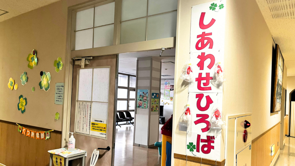 しあわせプラザの児童遊戯室は建物の2階にある室内遊びスペースです。エレベーターで2階に上がり、左側に進むと「しあわせひろば」の看板が見えてきます。