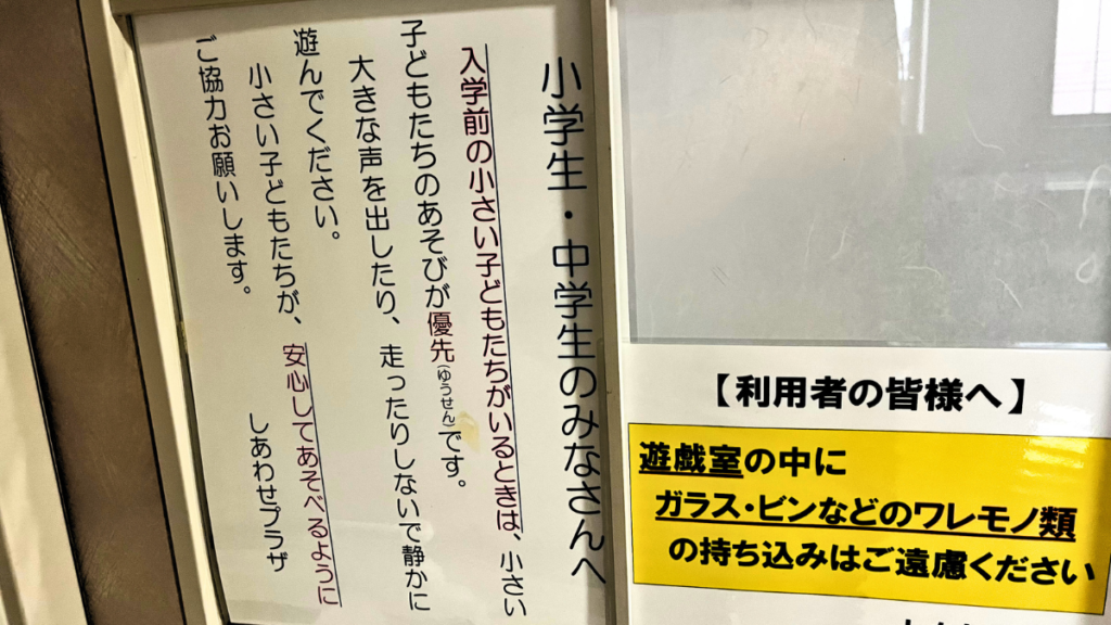 また、安全を考慮し、遊戯室の中にガラスやビンなどのワレモノ類は持ち込みを遠慮してほしいと記載された貼り紙もあります。
